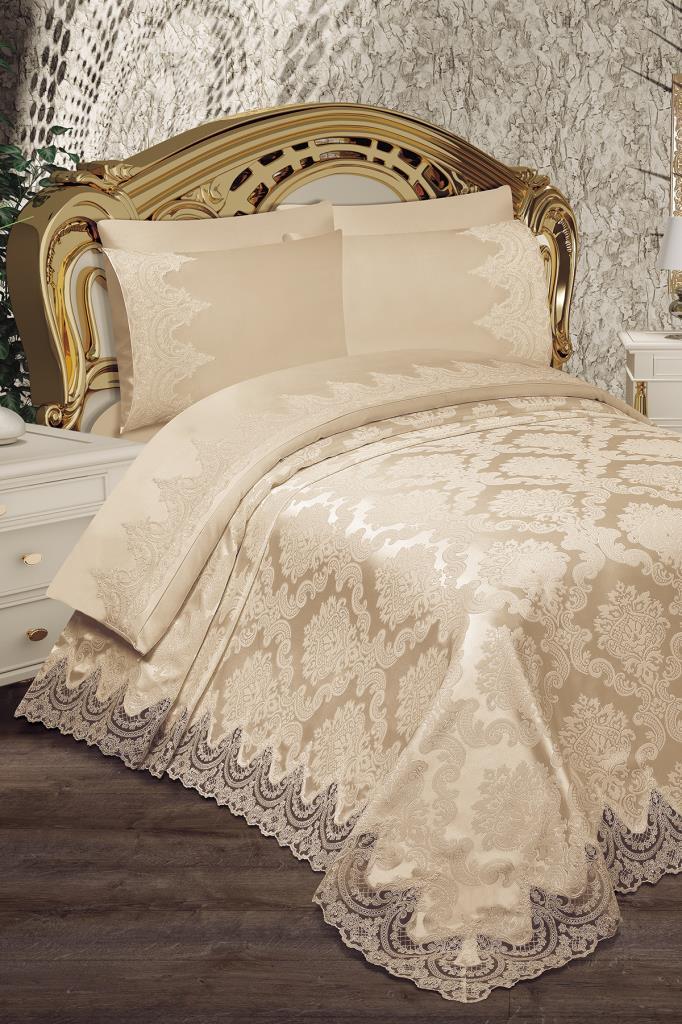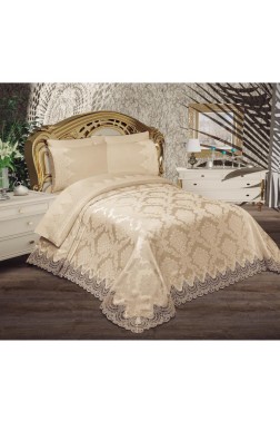 Alev King Size Bedspread Set 6pcs, Coverlet 230x240, Bedsheet 230x240, Double Bed, Brocade Fabric Beige