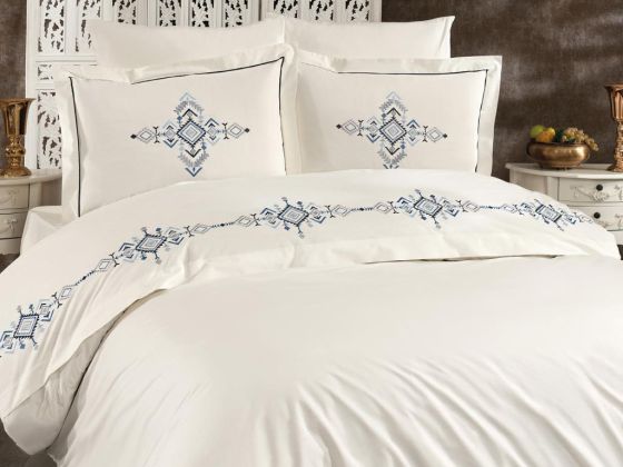 Alya Embroidered Full Size Duvet Cover Set, Duvet Cover 200x220, Sheet 240x260, Cream - Blue