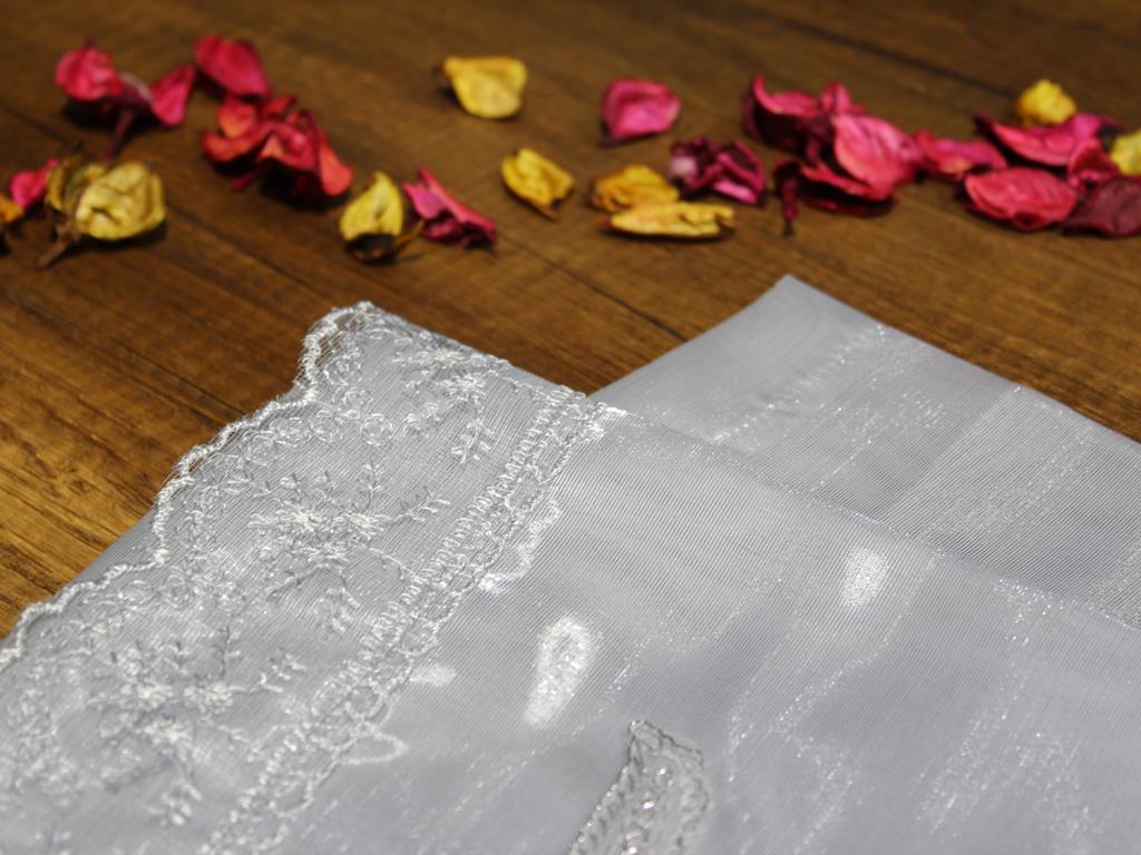 An elegant design has been created by embroidering French lace around the satin fabric and guipure on the end.