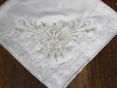 An elegant design has been created by embroidering French lace around the satin fabric and guipure on the end.