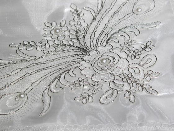An elegant design has been created with french lace around the satin fabric and guipure embroidery on the end.