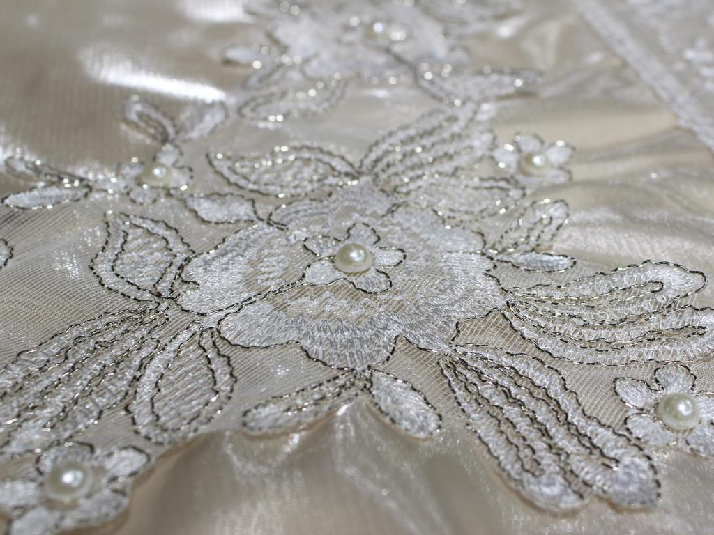 An elegant design has been created by embroidering French lace around the satin fabric and guipure on the end.