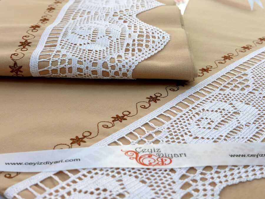 Product Information: Special Production Pico, Lace and Ribbed Duvet Cover Set.Brand: Çeyiz Diyarı. Duvet Cover: 200x225cm, Bed Sheet: 240x260cm, Pillowcase: 50x70 2 pieces of guipure 2 pcs plain.It is made of 100% cotton fabric.Washing instructions: Wash the product with machine or mannual at max 40 degrees.Iron with warm iron.Do not use bleach and chemical stain remover - keep dark colors as separate as possible while washing -Do not keep wet.Can be dried in drying machine.