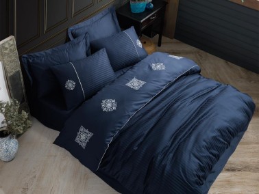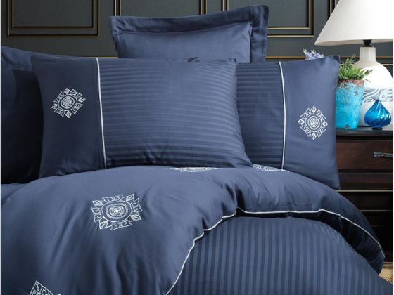 Elegant Embroidered Cotton Satin Double Duvet Cover Set Zeugma Navy Blue