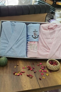 Family Embroidered Bathrobe Set 4 pcs, Bathrobe M-L, Towels 90x50 cm Cotton Pink Blue