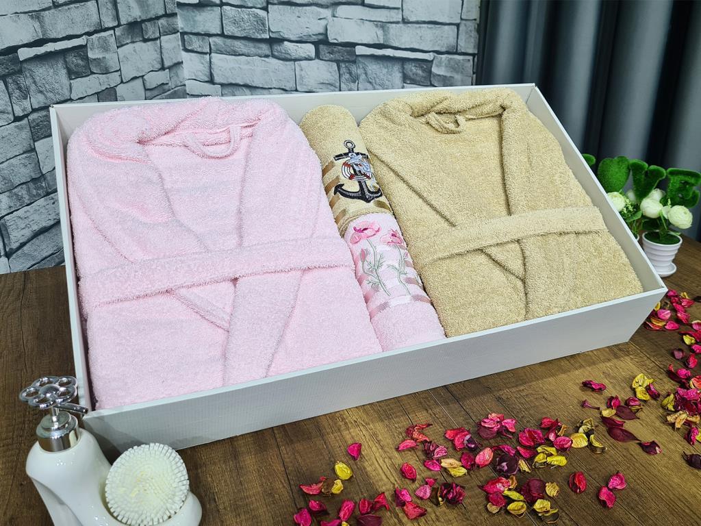 Family Embroidered Bathrobe Set 4 pcs, Bathrobe M-L, Towels 90x50 cm Cotton Pink Cappucino