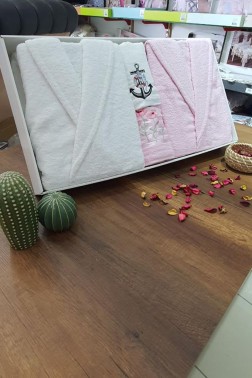 Family Embroidered Bathrobe Set 4 pcs, Bathrobe M-L, Towels 90x50 cm Cotton Pink White