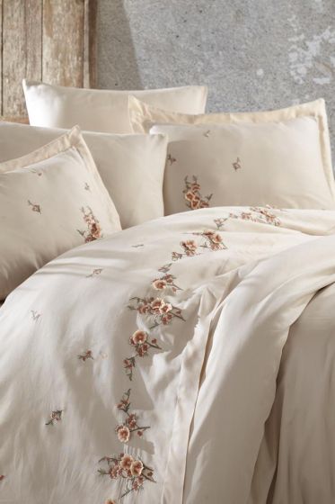 Felinda Embroidered 100% Cotton Sateen, Duvet Cover Set, Duvet Cover 200x220, Sheet 240x260, Double Size, Full Size Champagne