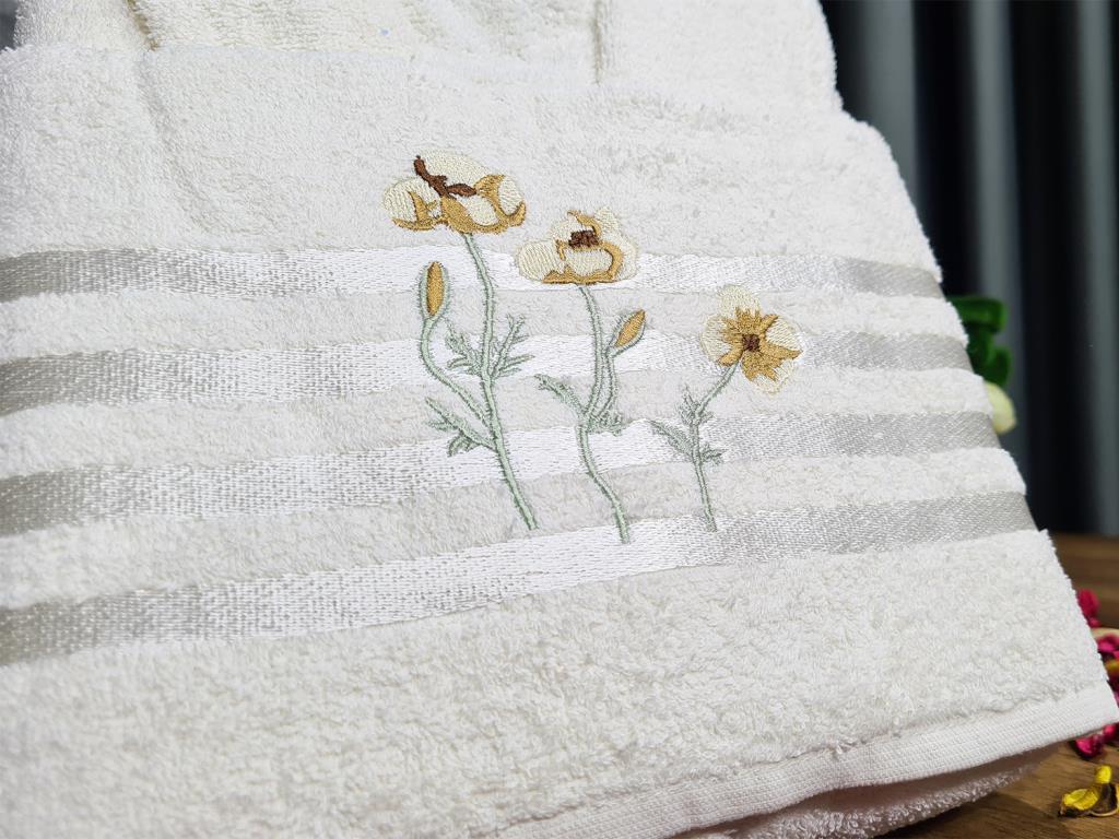 Flower Embroidered Bathrobe Set 2 pcs, Bathrobe M-L, Towels 90x50 cm Cotton Cream