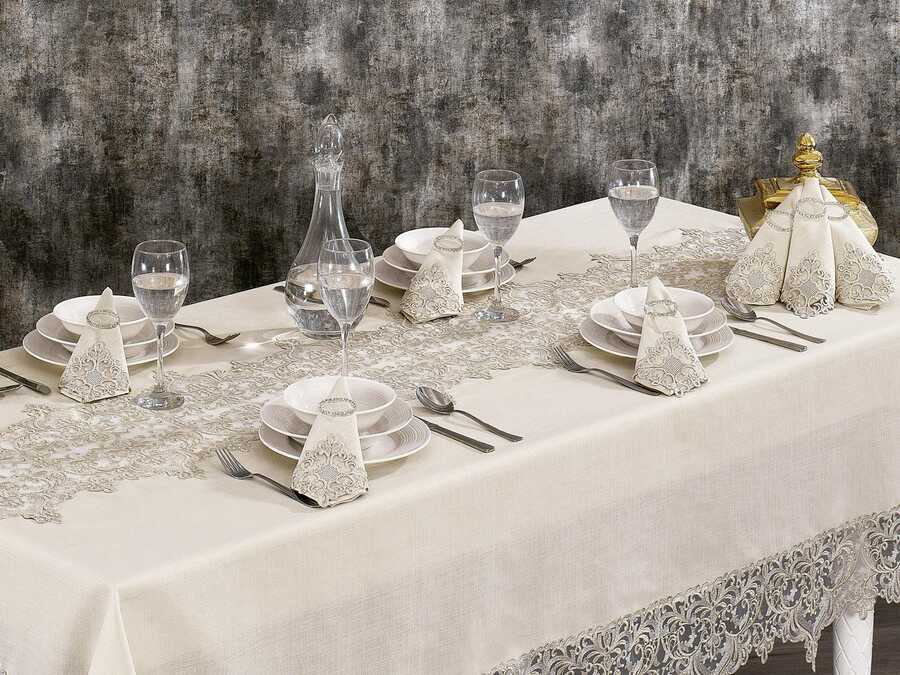 Product Information: French Lace 25-piece Dinner Set. Brand: Çeyiz Diyarı.Table Cover: 160 x 260 cm,Napkin:35x 35cm 12 pieces,Rings 12 pieces.Silk Slub Fabric. Stain and dirt-resistant fabric.A stylish design was created by applying French lace on the 4 sides of the tablecloth. You can wash in machine or mannual at max 40 degrees. Wash the first wash by turning it upside down with warm water.Always backwash extends product life.Do not use bleach and chemical stain remover - keep dark colors as separate as possible while washing.Do not keep them wet. You can dry it with a dryer. Iron it with a warm iron.