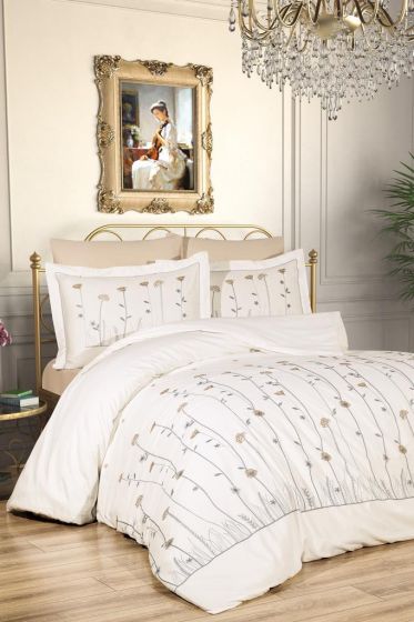 İpek Embroidered Full Size Duvet Cover Set, Duvet Cover 200x220, Sheet 240x260, Cream - Cappucino