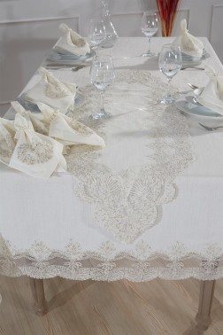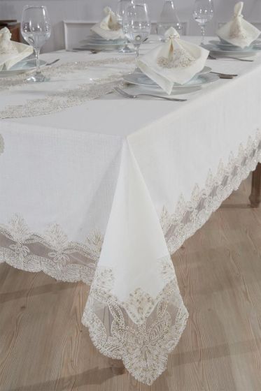 Midye Dinner/Lunch Set 18 pcs, Tablecloth 160x220, Runner 35x150, Napkins, Ring Cream
