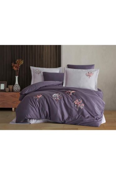 Root Embroidered 100% Cotton Sateen, Duvet Cover Set, Duvet Cover 200x220, Sheet 240x260, Double Size, Full Size Plum