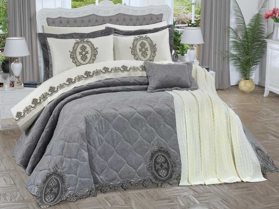 Örtü üzeri ve kenarları fransız güpürü ile dikilerek ürün modern ve zerafet dolu bir hal almıştır.