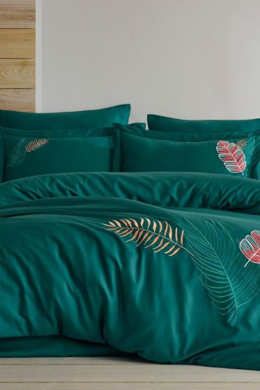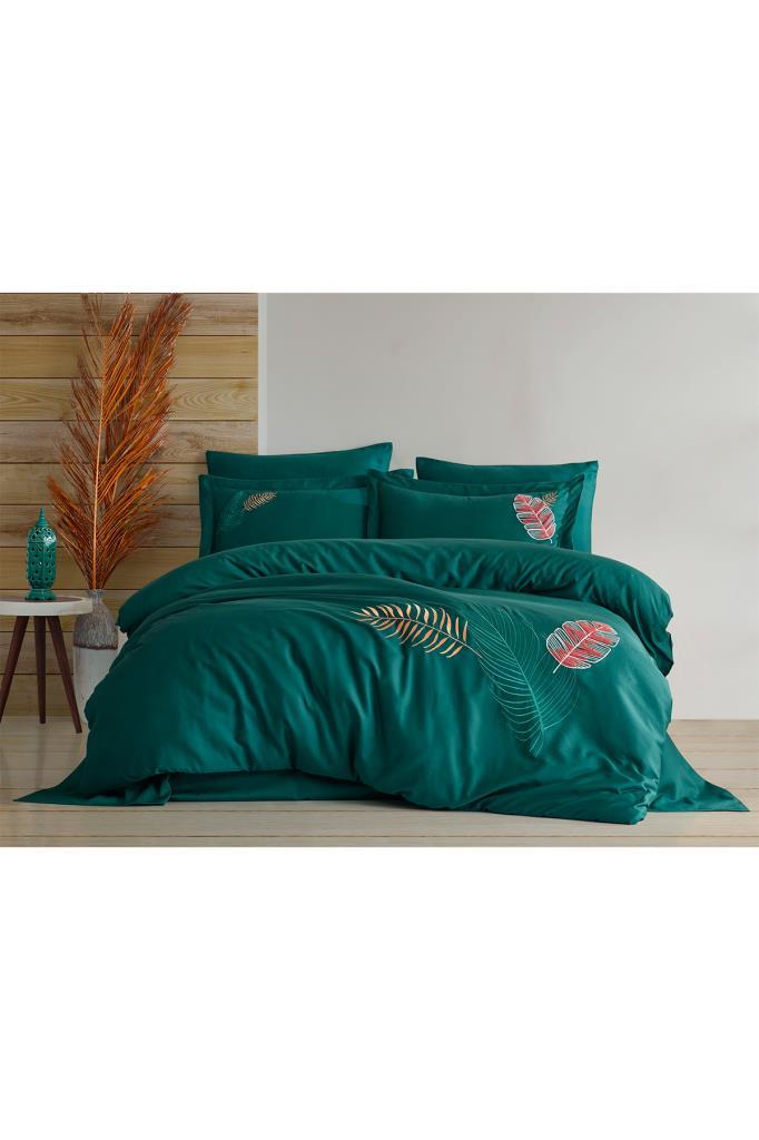 Talia Embroidered 100% Cotton Sateen, Duvet Cover Set, Duvet Cover 200x220, Sheet 240x260, Double Size, Full Size Green