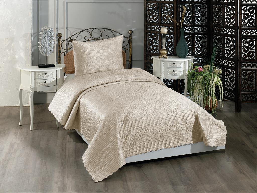 Velica Velvet Bedspread Set 2pcs, Coverlet 180x230, Pillowcase 50x70, Single Size, Queen, Cream
