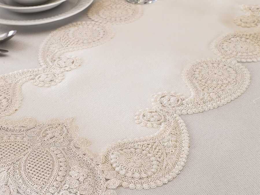 Stain Resistant Etuval Made of Linen Fabric. A special design has been created by adorning the Four Circles of the Table Cloth and the Runner ends with French Stone Guipures.WASHING INSTRUCTIONS